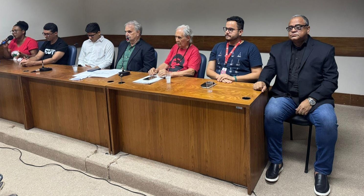 Compuseram a mesa: Ivoneide Assunção (Movimento dos Trabalhadores Rurais Sem Terra – MST/Bahia), Adelmo Andrade (Central dos Trabalhadores e Trabalhadoras do Brasil – CTB), Orlando Pereira (Central Única dos Trabalhadores – CUT), Rafael Lopes (representando a Cáritas e o Sinjorba), Eric Pereira (Rede MIDICOM – Rede de Mídias Comunitárias de Salvador) e Jonicael Cedraz (Fórum Nacional pela Democratização da Comunicação (FNDC/Bahia).