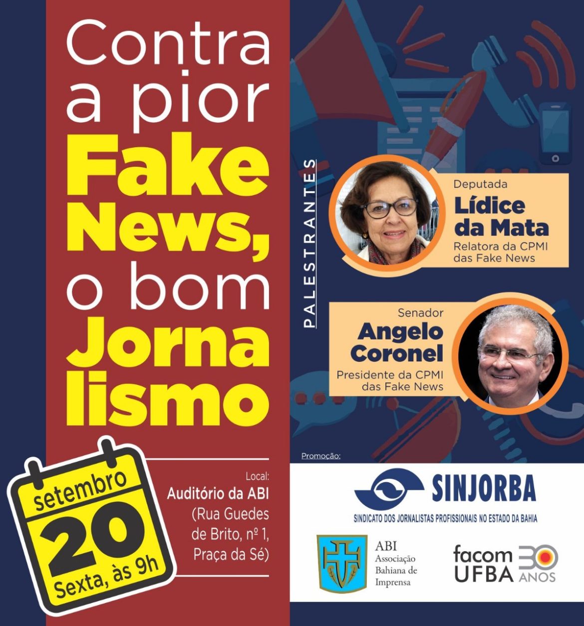 Para discutir a propagação de notícias falsas nos meios digitais e as consequências desse processo à democracia e à categoria dos jornalistas, ocorrerá em Salvador o debate “Contra a pior fake news, o bom jornalismo”. A atividade terá a participação dos parlamentares que estarão à frente da recém-instalada Comissão Parlamentar Mista de Inquérito (CPMI) da Fake News, o senador Angelo Coronel (presidente), e a deputada federal Lídice da Mata (relatora). Também farão parte da mesa o presidente do Sindicato dos Jornalistas Profissionais da Bahia (Sinjorba), Moacy Neves, o presidente da Associação Bahiana de Imprensa (ABI), Walter Pinheiro, e a diretora da Faculdade de Comunicação/Ufba (Facom), Suzana Barbosa. O evento é aberto ao público e será realizado no auditório da ABI, na Rua Guedes de Brito, nº 1, Praça da Sé.