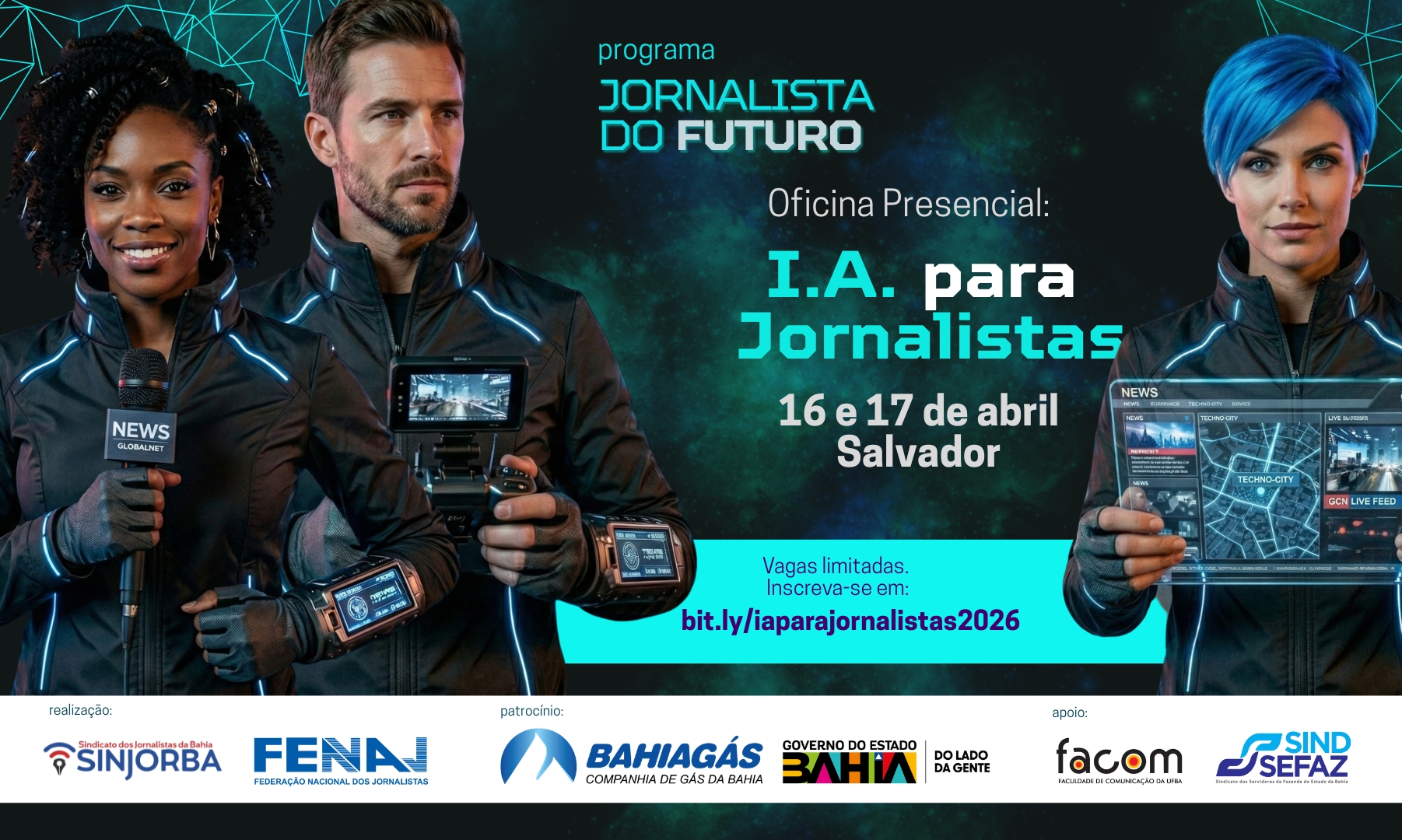 O Sindicato dos Jornalistas Profissionais do Estado da Bahia (Sinjorba) realiza, nos dias 16 e 17 de abril de 2026, Faculdade de Comunicação da UFBA (Facom), em Salvador, uma nova edição da oficina Inteligência Artificial para Jornalistas, como parte do programa Jornalista do Futuro. A atividade integra as ações do mês do jornalista.