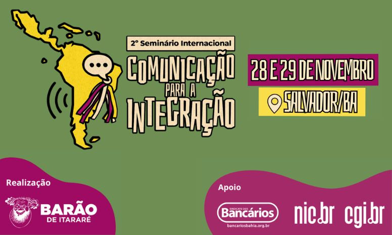 Salvador recebe, nos dias 28 e 29 de novembro, a 2ª edição do Seminário Internacional de Comunicação para a Integração, considerado o maior encontro do ano dedicado à comunicação independente, comunitária e popular na América Latina e no Caribe. O evento, promovido pelo Centro de Estudos da Mídia Alternativa Barão de Itararé, será realizado no Ginásio dos Bancários, na Ladeira dos Aflitos, e deve reunir representantes de mais de 10 países.