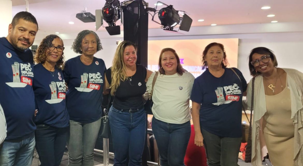 Dirigentes do Sinjorba, acompanhados da presidente da Federação Nacional dos Jornalistas, Samira Castro, participaram da solenidade de abertura do seminário “Os desafios da comunicação numa era de desinformação e ataques à democracia”, na noite de quinta-feira (1), no auditório da SSP-BA. No evento, promovido pelo Centro de Estudos e mídia Alternativa Barão de Itararé, os sindicalistas, que integram o Comitê Baiano em Defesa do Diploma de Jornalista, defenderam a aprovação da PEC nº 206/2012, a PEC do Diploma, que tramita na Câmara Federal.